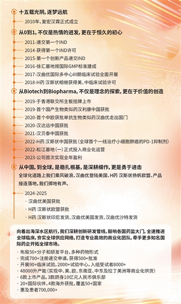 自2010年创立以来,复宏汉霖始终秉持“以患者为中心”的理念初心,在研发、生产以及商业化领域持续突破,并在国际化征程上持续进击,终成十五年辉煌成就。截至目前,公司已有6款产品在中国获批上市,4款产品在国际获批上市,惠及全球超70万患者,触达全球50多个国家和地区。面向下一个十五年,复宏汉霖将继续聚焦临床需求,持续打造差异化的创新产品管线,同时携手合作伙伴加速国际市场开拓,让可负担的高质量生物药造福全球更多患者。